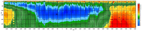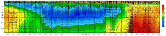 Figure 6 is the inversion resistivity cross-section diagram of Line 2 in the area. As can be seen from the figure, similar to Line 1, the inversion resistivity curve of Line 2 is basically of the KHA type. In the shallow part of the cross-section, there is relatively high resistivity, and after passing through the high-resistivity area, there is relatively low resistivity. After reaching a certain depth, the resistivity gradually increases as the depth increases.