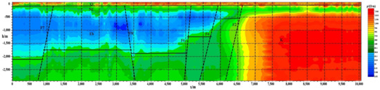 Figure 5 is the geological interpretation cross-section diagram of Line 1. According to the inferred inversion resistivity, the thickness of the high-resistivity layer on the surface is about 100 m, and the thickness of the low-resistivity layer below the high-resistivity layer varies greatly. F3 and F4 are the main faults controlling the fault-depression basin in the profile. According to the inferred inversion resistivity, the fault displacement of F3 exceeds 1000 m. The low-resistivity layer in the central part of the basin is very thick, and the maximum thickness of the low-resistivity layer at less than 10 Ω·m exceeds 700 m, and the maximum depth of the basement burial exceeds 2500 m.