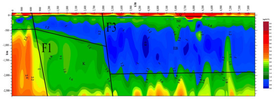Figure 4 is the inversion resistivity cross-section diagram of Line 1 in the area. It can be seen from the figure that the inversion resistivity curve is basically of the KHA type. In the shallow part of the cross-section, there is relatively high resistivity, and after passing through the high-resistivity area, there is relatively low resistivity. After reaching a certain depth, the resistivity gradually increases as the depth increases. There are obvious lateral resistivity mutation zones near—2700 m and 2900 m respectively. It is inferred that these lateral resistivity mutation zones are caused by fault structures (numbered as F3 and F4 respectively).