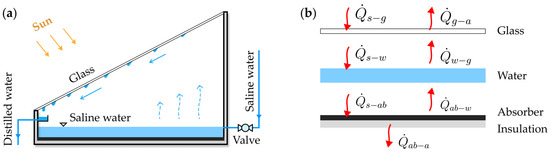 Schematic representation of single-slope solar still: (a) basic working principle, including saline water feeding, evaporation, condensation, and collection of distilled water; (b) heat transfer rates, including solar to glass , glass to ambient , solar to water , water to glass , solar to absorber , absorber to water , and absorber to ambient .