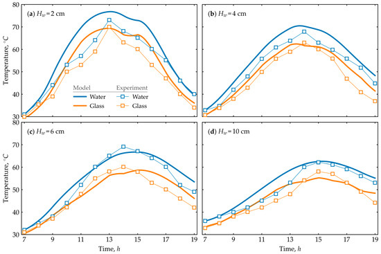 Comparison of numerical and experimental results [27] for water and glass temperature variations over time at different water depths in the basin: (a) 2 cm; (b) 4 cm; (c) 6 cm; (d) 10 cm.