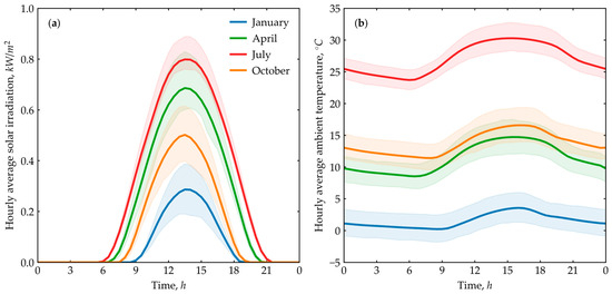 Seasonal meteorological data for Aktau: (a) hourly average solar irradiation; (b) hourly average ambient air temperature. The bold line represents the hourly average, with shaded bands indicating the 25th to 75th percentiles.