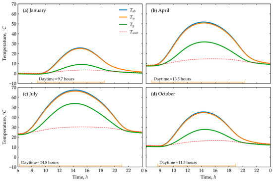 Figure 4 presents data on the temperature variation of the absorber (), water (), and glass () for the four seasons. The temperatures of the absorber and water are nearly identical across all seasons. For instance, in January, the minimum temperature of the absorber is −0.34 °C, while the water temperature is −0.37 °C. The maximum temperatures are 25.73 °C for the absorber and 25.14 °C for the water. Similarly, in July, the minimum temperature of the absorber is 22.99 °C, and the water temperature is 22.96 °C. The maximum temperatures are 67.23 °C for the absorber and 66.20 °C for the water. For comparison, the maximum temperature of the glass is 9.02 °C in January, 31.73 °C in April, 53.77 °C in July, and 27.75 °C in October. Consequently, the peak glass temperature in January is 64.12% lower than the peak water temperature, while in July, the difference is 18.78%.