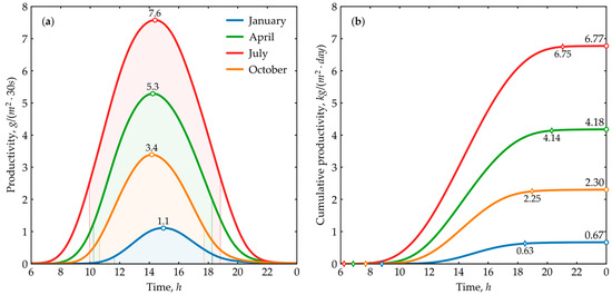 Temporal distribution of productivity: (a) instantaneous values, highlighting peaks; (b) cumulative values, distinguishing daytime and total productivity.