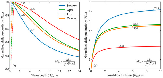 Influence of key parameters: (a) effect of varying water depth on daily productivity, normalized by its maximum value; (b) impact of insulation thickness on daily productivity, normalized by its minimum value.