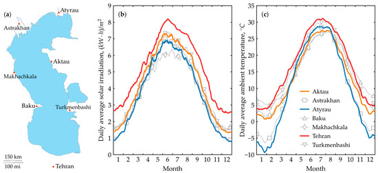 Meteorological data for coastal cities along the Caspian Sea: (a) locations of coastal cities; (b) daily average solar irradiation; (c) daily average ambient air temperature.