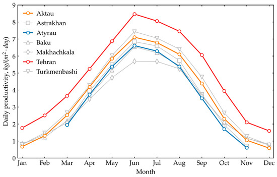 The freezing temperature of Caspian seawater with a salinity level of 13 g/kg ranges from −0.7 °C to −1.0 °C. According to the 13-year average air temperature data presented in Figure 7, in all cities except Atyrau and Astrakhan, the temperature does not drop below 0 °C throughout the year. The primary focus of our work was on the city of Aktau; therefore, the effects of seawater freezing were not considered in the model. In contrast, in Atyrau and Astrakhan, the average ambient temperature falls below −1.0 °C during the winter months. Consequently, as shown in Figure 8, productivity calculations are not conducted for these cities during these months.
