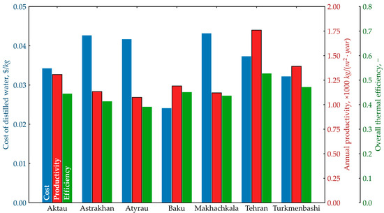 The maximum productivity and efficiency were obtained for Tehran, with values of 1760 kg/(m2·year) and 0.53, respectively. The minimum cost of distilled water was USD 0.024 per kilogram in Baku.