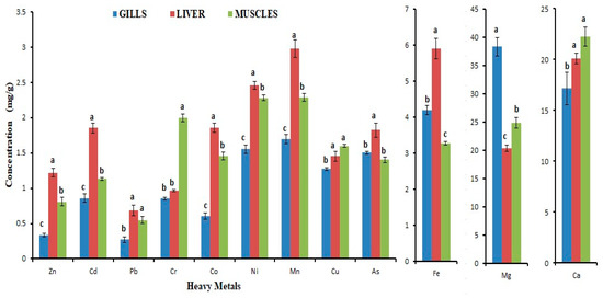 Due to their physiological roles, the liver, muscles, and gills are important organs for metal bioaccumulation [3,6,41,42,43,44]. The liver often acts as a detoxification and storage site for metals [45], while the muscles and gills are involved in nutrient absorption and respiration, respectively [46]. Understanding the distribution of heavy metals in these organs can offer insights into the extent of contamination and the potential health risks posed to humans who consume these fish [47].