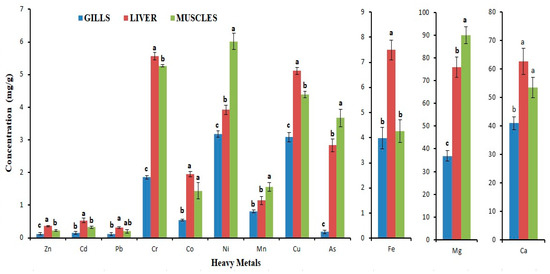 Level of trace elements and heavy metals in various tissues of M. seenghala. Data presented as mean ± SE (n = 9). The mean with different letters is significantly different (p < 0.05) (ANOVA followed by LSD test).