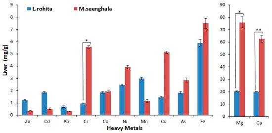 Concentration of trace elements and heavy metals (mg/g) in the liver tissue of L. rohita and M. seenghala. Asterisks represent the level of significance based on a two-sample t-test assuming equal variance (** = p < 0.01, * = p < 0.05).
