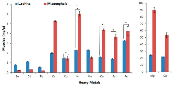 Concentration of trace elements and heavy metals (mg/g) in the muscle tissue of L. rohita and M. seenghala. Asterisks represent the level of significance based on a two-sample t-test assuming equal variance (* = p < 0.05).