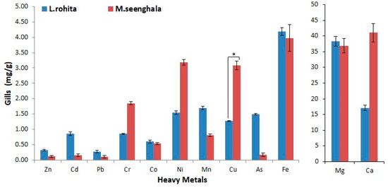 Concentration of trace elements and heavy metals (mg/g) in the gill tissue of L. rohita and M. seenghala. Asterisks represent the level of significance based on a two-sample t-test assuming equal variance (* = p < 0.05).