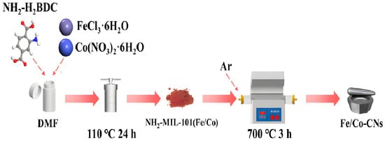 Under an Ar atmosphere, the prepared NH2-MIL-101(Fe/Co) is calcined in a tube furnace at 700 °C, with a heating rate of 5 °C/min. After maintaining the temperature for 3 h, it is cooled to room temperature (20 °C), washed with water and alcohol three times, and then dried in a vacuum drying oven to obtain the final product Fe/Co-CNs. The specific preparation process is shown in Figure 1.