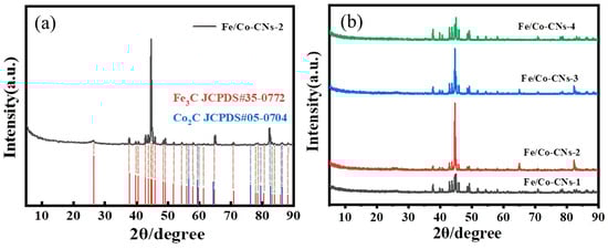 (a) XRD patterns of Fe/Co-CNs-2; (b) XRD patterns of Fe/Co-CNs-1, Fe/Co-CNs-2, Fe/Co-CNs-3, and Fe/Co-CNs-4.