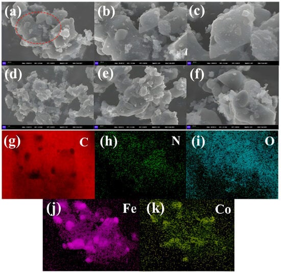 The morphological characteristics of Fe/Co-CNs-2 were characterized using SEM, as shown in Figure 3. In Figure 3a, the polygonal structure can be seen, which is the unsintered NH2-MIL-101(Fe/Co). The red circle in the magnified image of Figure 3a indicates this area, while Figure 3b,c show that the unsintered bimetallic MOFs have internal cavities. This indicates that, although the external structure of the bimetallic MOFs is intact, their internal structure has collapsed. Figure 3d–f shows another part of the surface morphology of Fe/Co-CNs-2, indicating that the sintered Fe/Co-CNs-2 has a blocky structure. In order to further verify the Co doping, EDS elemental analysis was conducted on Fe/Co-CNs-2. Figure 3g–k shows the elemental distribution of C, N, O, Fe, and Co in Fe/Co-CNs-2, indicating that these elements are evenly distributed and all present. The quantitative results in Table 2 (Quant Result) show that both iron and cobalt have been successfully doped.