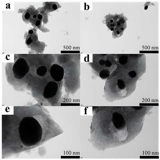 The TEM images of Fe/Co-CNs-2 are exhibited in Figure 4. The average particle size of Fe/Co-CNs-2 is between 100 and 200 nm. In Figure 4a–c, it can be observed that there are large black spherical particles, indicating the presence of two metals, Fe and Co, which proves successful Co doping. Meanwhile, the carbon layer was thicker, which is consistent with the larger bulk seen in SEM. Further magnification in Figure 3d reveals edge-like structures similar to hexagonal prisms, which may be structures retained by MOFs during baking. As shown in Figure 4e,f, the large black spherical particles were wrapped in a thick carbon layer, indicating that Fe and Co in Fe/Co-CNs-2 were tightly encapsulated in the carbon layer, preventing the leaching of metals.