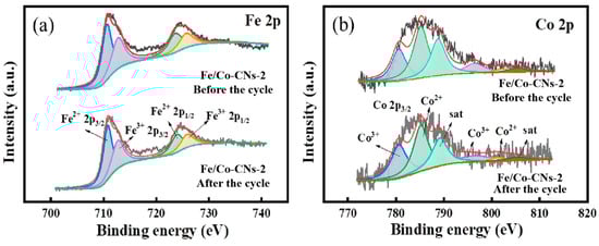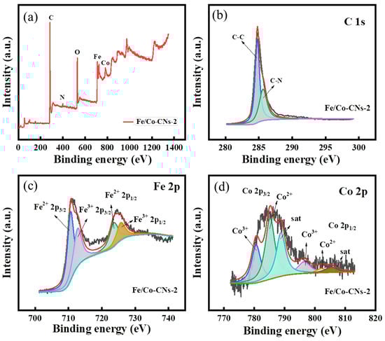 To further analyze the types of surface elements, valence states, and bonding behavior, Fe/Co-CNs-2 was subjected to XPS analysis. As shown in Figure 5a, the Fe/Co-CNs-2 composite material contains five elements: C, Fe, Co, O, and N. The C 1s spectrum is presented in Figure 5b, where the peak at 284.8 eV corresponds to the C-C bond, and the peak at 285.6 eV corresponds to the C-N bond. These values were calibrated with a reference binding energy of 284.8 eV. Regarding the Co 2p XPS spectrum in Figure 5d, multiple valence states of Co (Co2+ and Co3+) are evident. The peaks at 780.6 eV, 785.2 eV, 796.4 eV, and 801.4 eV represent Co 2p3/2 and Co 2p1/2 orbitals for Co3+ and Co2+. The observed satellite peaks at 788.8 eV and 805.3 eV are typically associated with Co3+, supporting the presence of cobalt in this oxidation state. The intensity of these satellite peaks can be related to the strong correlation effects in transition metals, indicating that they may contribute to both Co2+ and Co3+ states, although their exact attribution remains a subject of ongoing debate in the literature [24,25].