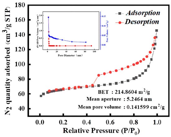A specific surface area porosity analyzer (BET, ASAP2020 HD88, Mack Instruments, Arlington, VT, USA) was used to measure the specific surface area and aperture. The material was heat-treated at 120 °C under nitrogen atmosphere for 2 h, and then the sample was subjected to nitrogen adsorption and desorption under liquid nitrogen environment to measure the specific surface area and aperture.