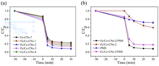 To find the ideal ratio, the catalytic activities of Fe/Co-CNs with various relative mass ratios were investigated because the quantity of doping Co2+ may alter the synergistic effects of Fe3+ and Co2+. The degradation efficiencies of Fe/Co-CNs-1, Fe/Co-CNs-2, Fe/Co-CNs-3, Fe/Co-CNs-4, and Fe/Co-CNs-5 were 80.54%, 93.34%, 86.47%, and 83.51%, respectively, as shown in Figure 9a. The best treatment efficacy was attained with an increase in the doping amount of the Co ion when the Co ion doping amount reached 20% within 30 min. However, when the Co ion doping level increased, the degradation rate reduced. This could be attributed to an excessive presence of Co ions, which may have disrupted the formation of MOFs and led to diminished performance of the resulting carbonized materials. Furthermore, Fe/Co-CNs-2 greatly outperformed Fe-CNs-7 (materials without doped Co ions) in its ability to degrade TC by activating PMS at 78.83%. This suggests that PMS and the synergistic impact of Co ions and Fe ions can effectively degrade TC [30]. The degradation rate of TC by Fe/Co-CNs-2 alone was only 28.39% for 30 min, as shown in Figure 9b. The degradation rate of TC when PMS was present alone was 40.54% within 30 min, demonstrating that the removal capacity was constrained when the catalyst and PMS operated separately. The degradation rate of TC by the Fe/Co-CNs-2/PMS system was much higher than that of the Fe/Co-CNs-2/PDS system. This suggests that Fe/Co-CNs-2’s ability to activate PMS is superior to that of Fe/Co-CNs-2’s ability to activate PDS.