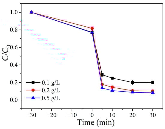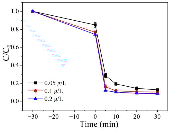 We investigated the impact of different Fe/Co-CNs-2 dosages (0.05 g/L, 0.1 g/L, and 0.2 g/L) on the degradation of TC by activating PMS since the catalyst dosage has a significant impact on the efficiency of the degradation process. According to Figure 10, when the Fe/Co-CNs-2 dosage was 0.05 g/L, the degradation rate of TC within 30 min was 87.92%, and when the dosage was increased to 0.1 g/L, the degradation rate reached 93.69% within 30 min. This is mostly because the system has more catalytic sites that can be used directly for the reaction. Adsorption-assisted catalysis can further improve the catalytic-degradation process because as the catalyst concentration rises, so does the amount of TC adsorbed. The degrading efficiency was marginally increased over 0.1 g/L by gradually increasing the catalyst dosage to 0.2 g/L. This is most likely caused by the small amount of TC in the solution. Therefore, 0.1 g/L Fe/Co-CNs-2 was determined to be the best dosage for additional studies from an economic standpoint.