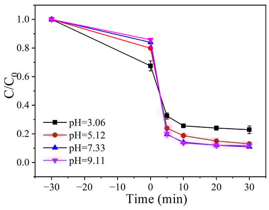 The initial pH of the solution also has an important impact on the degradation of TC in the Fe/Co-CNs-2/PMS system. As shown in Figure 13, the degradation efficiency of the Fe/Co-CNs-2/PMS system for TC was investigated over a wide pH range (3.06–9.11). When the pH value is 3.06, the degradation rate of TC within 30 min is 78.32%. This phenomenon occurs because, under acidic conditions, the H+ in PMS interacts with O-O to form hydrogen bonds, thereby inhibiting the decomposition of PMS [32]. When the pH value is 5.12, the degradation efficiency of TC by the Fe/Co-CNs-2/PMS system increases to 92.14%. As the pH value continues to rise to 7.33, the degradation efficiency of TC reaches 93.34%. At a pH value of 9.11, there is no significant change in TC degradation efficiency compared to a neutral environment. This indicates that the Fe/Co-CNs-2/PMS system can effectively degrade TC within a wide pH range.