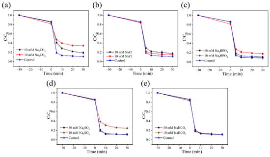 Effects of different anions on the degradation of TC in FeCo-CNs-2/PMS system: (a) Cl−, (b) CO32−, (c) HCO3−, (d) HPO42−, (e) SO42−.
