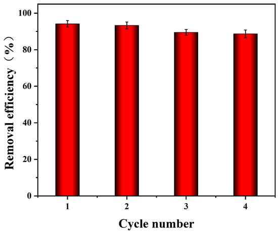 Stability is an additional significant marker for a catalyst’s capacity to be used more effectively in practice. Through cycling studies, the stability of the Fe/Co-CNs-2 catalyst is examined in this section. Figure 15 depicts the cyclic degradation of TC by the Fe/Co-CNs-2/PMS system (initial TC concentration of 20 mg/L, Fe/Co-CNs-2 dosage of 0.1 g/L, and PMS dosage of 0.2 g/L). We carried out numerous parallel trials, precipitated the catalyst after degradation, and washed and dried the deteriorated material to acquire the material for the subsequent cycle since the catalyst material has a specific magnetic. The findings demonstrated that TC’s degrading efficiency did not significantly decline after four cycles of use, peaking at 88.7% in the fourth cycle, demonstrating the catalyst’s strong catalytic stability. Another element for gauging the stability of the catalyst is the degree of metal dissolution. It was discovered that 0.10 mg/L and 0.08 mg/L of iron and cobalt ions, respectively, dissolved in the Fe/Co-CNs-2/PMS system in 100 mL of 20 mg/L TC, proving that the activation of PMS by Fe/Co-CNs-2 is not activated by metal ion dissolution, but by the catalyst.