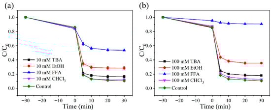 To identify the active species in the FeCo-CNs-2/PMS system, this study conducted quenching experiments by adding different radical scavengers and evaluated the contribution of radicals in the degradation process of TC. We used tert-butanol (TBA), ethanol (EtOH), furfuryl alcohol (FFA), and CHCl3 as scavengers for •OH, SO4•−, singlet oxygen (1O2), and superoxide (O2•−), respectively. As shown in Figure 16, when 10 mM of CHCl3 is added to the system, the degradation rate of TC remains essentially unchanged. Even when CHCl3 is further added to the system up to 100 mM, the degradation rate of TC only decreases by 1.6%. This indicates that Cl− has only a minimal role in the system. When 10 mM of tert-butanol was added to the system, the degradation rate of TC decreased by 4.5%. Continuing to increase tert-butanol to 100 mM, the degradation rate of TC only dropped by 5.3%, showing no significant change compared to 10 mM. This indicates that the contribution of •OH in the system to the degradation efficiency of TC is limited. When 10 mM of ethanol was added to the system, it was observed that the degradation rate of TC decreased by 20%. Further increasing the ethanol concentration to 100 mM resulted in a 31% decrease in the degradation rate. Although ethanol does have a certain capturing effect on hydroxyl radicals, the contribution of hydroxyl radicals to the degradation efficiency of the system is quite limited. This indicates that SO4•− plays a significant role in the degradation of TC in the system. When 10 mM of furfural was added to the system, the degradation rate of TC decreased by 50.4%. Continuing to increase the furfural concentration to 100 mM resulted in an 86.7% decrease in the degradation rate of TC, with its catalytic activity nearly completely suppressed. Therefore, it can be demonstrated that in this system, 1O2 plays a dominant role.