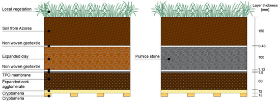Considering the characteristics of some of these materials, an analysis was conducted on how they could be used in the composition of the layers that make up green roofs. An eight-layer green roof solution was considered (ordered from bottom to top): support layer, thermal insulation layer, waterproofing layer, waterproofing protection layer, drainage layer, filtering layer, substrate, and vegetation. Analyzing information from [46,47,48,49] on the cost and ease of application of the materials, cryptomeria wood can be used in the support layer, pineapple fiber in the waterproofing protection and filtering layers, pumice stone in the drainage layer, and Azorean soil in the substrate layer.
