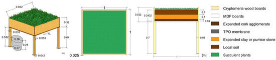 The layers of the prototypes are composed of the following materials: The support layer consists of cryptomeria wood, the thermal insulation layer consists of expanded cork particle boards, the waterproofing layer consists of TPO (thermoplastic polyolefin) membranes, the protection layer is a non-woven geotextile, the drainage layer is either expanded clay or pumice stone, and the filtering layer consists of a non-woven geotextile. Finally, the substrate layer uses local substrate, and the vegetation layer uses succulent plants.