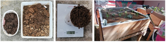 This monitoring consisted, first and foremost, of measuring the weight of a sample of substrate in a standard measuring cup before (dry substrate) and after watering (wet substrate). The watering was also standardized, using 65 L of water, and the dry substrate sample was removed from the prototypes one day before the monitoring so that it could dry. Next, the prototypes were analyzed in terms of waterlogging, checking for permanent puddles of water, and in terms of drainage, verifying the capacity to drain water from the surface. Finally, the color of the drained water was analyzed, and the development of the planted vegetation and the maintenance required throughout the monitoring period were also analyzed. Figure 8 shows some of the steps in the substrate-monitoring process.