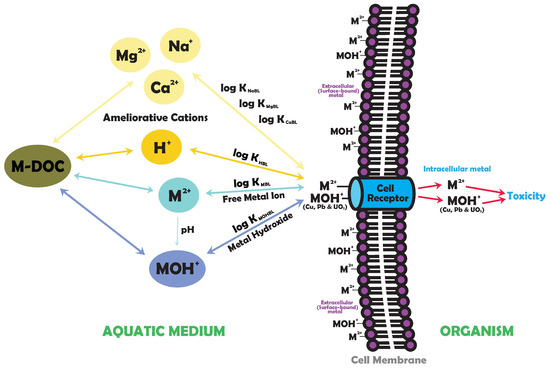 - Metal speciation in water: Free metal ions (Mz+) are typically toxic, but other positively charged species (MOH(z−1)+, MF(z−1)+) can also cause toxicity (Figure 1), especially for metals that hydrolyse within the pH range of natural freshwaters (pH 5.5–8.5), such as uranium (as uranyl, UO22+), copper (Cu2+), and lead (Pb2+). Predicting toxicity is challenging since total or dissolved metal concentrations are not reliable indicators of metal bioavailability [9]. Binding with anions, like bicarbonate or dissolved organic matter, reduces the concentration of free metal ions and reduces toxicity;