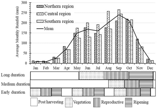 Three types of rice varieties are commonly grown in Cambodia: long-duration (LD), medium-duration (MD), and early-duration (ED) varieties. The cropping periods for LD, MD, and ED rice varieties normally span six, four, and three months, respectively (Figure 2). LD rice is primarily grown in the rain-fed areas, with the seeding period occurring from mid-May to mid-July, and harvesting taking place between mid-October and mid-December. MD rice is grown during the wet season, from mid-August to mid-December.