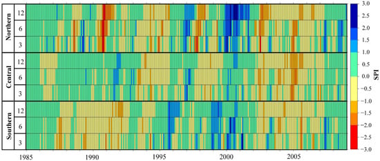 The drought intensity decreased with the increasing timescale. The most intense droughts at all timescales were observed in the Northern region. According to Table 1, DI1 values of ≥2 indicate that extreme drought was prevalent in the Northern region, while the Central and Southern regions generally experienced droughts of moderate to severe intensity.
