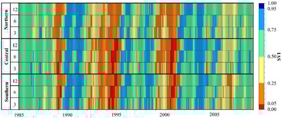 In terms of the DD, as shown in Tables S4–S6, the three regions exhibited similar DD values, with a slight increase observed from shorter to longer timescales. The DD lengths across all timescales in the Central region were comparable. However, in the Northern and Southern regions, the longest DD periods at SVI3 (DD = 23 and 28 months, respectively) were approximately half those observed at SVI6 (DD = 42 and 41 months, respectively) and SVI12 (DD = 43 and 43 months, respectively). The results also indicated that the longest DD across all three regions occurred between 1992 and 1995.