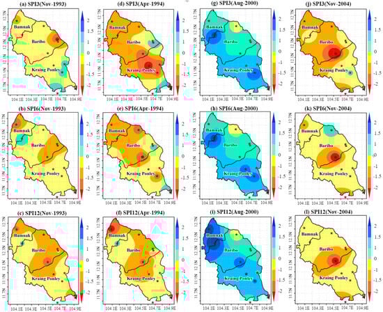 Figure 5 presents the drought distribution map based on the SPI across the Baribo basin. The color gradient on the map represents varying SPI values, with the transition from yellow to red indicating increasingly dry conditions, and that from light to dark blue signifying progressively wetter conditions. Near-normal conditions are depicted in shades of yellow to green. In November 1993 and April 1994, drought conditions affected a large area of the Northern and Central regions. At the same time, the Southern region experienced mostly slight drought (0 < SPI < −1), with moderate drought conditions occurring only in the Northern part of this region. By August 2000, the entire Baribo basin received high rainfall, except for the eastern part, which is the low-lying area near the Tonle Sap Great Lake. In November 2004, all three timescales indicated that drought conditions were primarily concentrated in the Central part of the basin. The analysis of the four selected events showed that drought occurred in the whole Baribo basin; however, the Central region generally experienced a higher drought intensity.