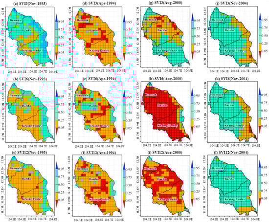 Figure 5 and Figure 6 illustrate the distributions of the droughts and vegetation greenness densities across the Baribo basin, respectively. It is important to note that agricultural areas are predominantly located in the eastern parts of the Northern and Central regions and in nearly the entire Southern region [39]. Four DEs were selected to develop the drought map using the SPI and SVI at the 3-, 6-, and 12-month timescales. The selected DEs correspond to months where the SPI indicated at least a severe drought (SPI ≤ −1.5) or the SVI indicated very poor vegetation conditions (SVI ≤ 0.05). The four selected DEs occurred in November 1993, April 1994, August 2000, and November 2004. The following describes the distribution of drought across the entire Baribo basin.