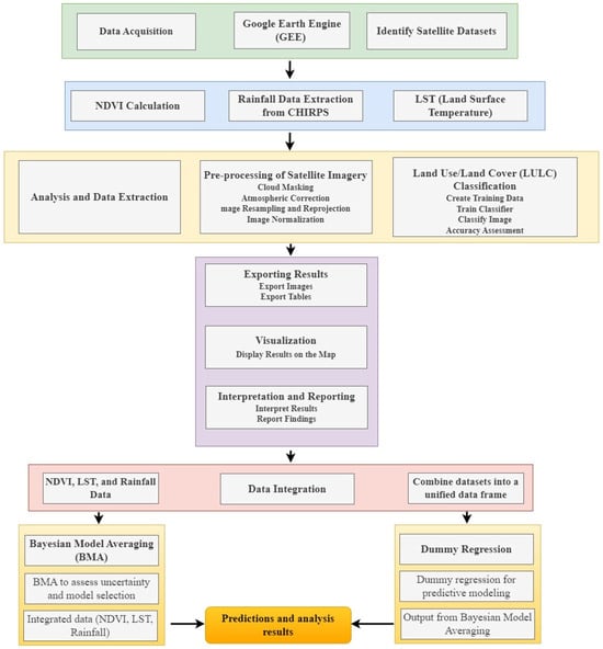 - BNM results show the impact of vegetation dynamics (i.e., the NDVI) on temperature, precipitation, and the LST across the study area. The results indicated a predominantly negative relationship between the NDVI and the LST, with coefficients ranging from −3.1144 °C for Pixel 1 and −3.4654 °C for Pixel 3, showing a decrease in the LST with increased vegetation. However, some areas exhibited positive relationships, such as Pixel 5 with a coefficient of 3.3456 °C. Additionally, strong positive correlations were observed between the NDVI and precipitation, particularly in pixels like Pixel 1 (27.5085 mm) and Pixel 2 (44.3932 mm), highlighting precipitation’s role in vegetation growth. For NDVI vs. Temperature, the maximum coefficient is 5.2697 °C (Pixel 3) and the minimum coefficient is -5.3839 °C (Pixel 2). For NDVI vs. LST, the maximum coefficient is 6.6322 °C (Pixel 20) and the minimum coefficient is −7.1513 °C (Pixel 22). For NDVI vs. Precipitation, the maximum coefficient is 44.3932 mm (Pixel 2) and the minimum coefficient is 1.7612 mm (Pixel 21). These findings underscore the importance of considering local factors when analyzing NDVI’s effects.