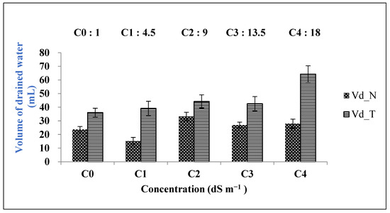 Variation in the average volume of drained water with the salinity level of the irrigation water (Vd_N: Volume of untreated drained water; Vd_T: Volume of treated drained water).