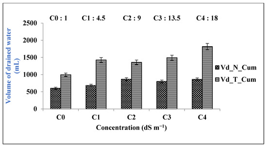 The drained fraction was evaluated for the volume of each irrigation (Figure 1) and for the cumulative volume of each treatment (Figure 2). The findings revealed that the ET of saline water significantly affected the volume of drainage water. Indeed, the volume of the ET irrigation water was significantly higher than that of the untreated irrigation water for all five concentrations: C0, C1, C2, C3, and C4. The fraction of the drained water after electro-magnetization increased from about 33 to 56% in comparison with non-treated saline water, which showed an increase from 20 to 26%. These results show that the increase in the volume of drainage water was observed over time with the rise in the irrigation frequency. Similar findings were reported in the study conducted by Zlotopolski [16] who proved that the total volume of water collected in reservoirs under the columns (leachate) was different between the magnetically treated water (MTW) and untreated columns. Hamza [66] also stated an increase in the volume of drainage water by 20%, compared to non-magnetized water (NMW) caused by the augmentation in the magnetic field in the drainage water. In addition, the effect of magnetization was reported to increase at a longer exposure time of water to the magnetic field [64,67]. In a similar way, Zúñiga et al. [68] reported that the increase in the time of water exposure to magnetism could modify the polarity and intensity of water molecules and raise their excitation, which allowed the efficient reorganization of their clusters.