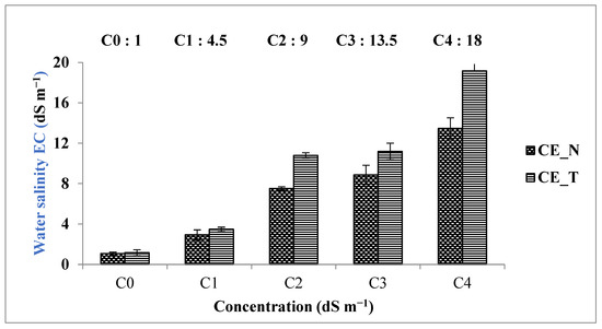 The results in Figure 3 revealed that the EC values in drained water from soil irrigated with electro-magnetized water were higher than those in untreated water. Hence, an increase in EC of drained water of 2.72, 3.48, 10.79, 11.18, and 19.15 dS.m−1 for C0, C1, C2, C3, and C4, respectively, was observed. Based on these results, the irrigation with electro-magnetized saline water allowed to remove more soluble salts from the soil receiving high saline irrigation water. Gudigar and Hebbara [61] stated that the use of magnetized water increased the salt content in drainage water, which was not the case when applying non-magnetized water. This aligns with the findings of Mohamed and Bassem [69] who observed that the values of EC in drainage water irrigated with magnetized water were higher than in non-magnetized water. Additionally, Raheem [70] noticed that by increasing the magnetic intensity, magnetized water can positively affect salt leaching with an augmentation of EC values of the drained water. The salt content, at a lower depth in a column of soil irrigated with MTW, was higher than that in the control. Therefore, the finding in this study aligned with the previous studies in terms of the salt accumulation in lower depths of the soil EC contents augmentation in the drainage water.