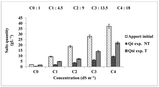 For the same electrical conductivity of irrigation water (treated water and untreated water), the comparison between the quantities of salts in the soils deduced from the final salinity (ECe) and those estimated from the difference between the salts brought back by the irrigation water and those evacuated by the drainage water shows that these quantities are higher in soils for water of concentration C0 and C1, and lower for the other three concentrations (C2, C3, and C4).