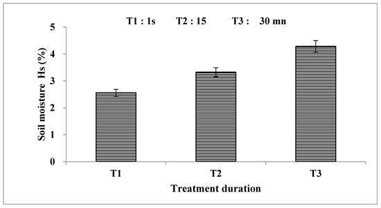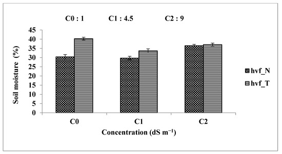 The soil moisture contents exhibited a significant difference (p < 0.05) between the ET irrigation water and the untreated irrigation water for the five concentrations (Figure 5). The results demonstrated that irrigation with ETM water, compared to untreated water, significantly increased the soil moisture up to 9.9% for C0 (1.0 dS m−1). However, these findings did not show a remarkable rise for C1 and C2. Accordingly, the use in certain conditions of electro-magnetized water for irrigation is approved to save irrigation water. The results dealing with the effect of electromagnetic on soil salinity are consistent with those obtained by [72] where a small reduction in the rate of soil evaporation was observed when electro-magnetized water was applied. Zlotopolski [16] showed that soil irrigated with magnetized water is wetter than the control soil irrigated with the same amount of non-magnetized water. Moreover, Gabrielli et al. [73] also found that the formation of aragonite, after the magnetization of water, increases the osmotic pressure of the soil with the decrease in evaporation. It was also concluded that the exposure time of water to an electromagnetic field minimizes its surface tension, raises its solubility and, subsequently, increases the wettability of the soil [54]. Furthermore, Moosa et al. [34] found that the maximization of the water content of soil may be due to the degradation in the surface tension and water viscosity after exposure to the electromagnetic fields. The high soil moisture obtained under electro-magnetized irrigation water was due to the fact that the water molecules were influenced by hydrogenic bonds and Van der Waals forces and in reaction with the released ions, which made the water more cohesive [61]. Thus, the molecules of water could be easily attached to the soil particles and water molecules might easily penetrate into the microspaces of the soil particles [61]. Moreover, when passing water through the electro-magnetized field, the structure and some physical characteristics changed [53]. The increase in soil moisture could be attributed to the decomposition of macromolecules of magnetized water into smaller molecules, which increases the mobility of water and then allows it to enter smaller soil pores. This, consequently, improving the retention of water soil macroporosity [8,62].