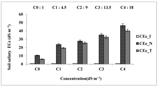 Variation of the average EC value of the soil (ECe_I: Initial electrical conductivity; ECe_N: Untreated electrical conductivity; ECe_T: Treated electrical conductivity).