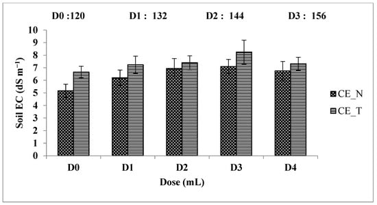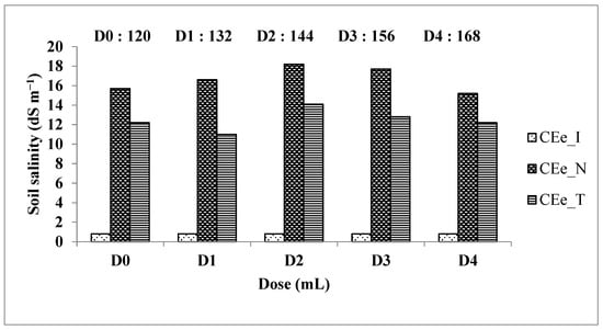 The soil salinity variation under different treatments was also investigated depending on the dose and the results are presented in Figure 11. The results show that there is a significant decrease in soil salinity when saline electro-magnetized water is used for irrigation compared to the irrigation with untreated water.