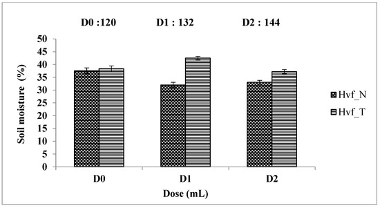 According to Figure 10, a significant difference between the moisture content of the soil irrigated with treated and untreated water for doses D1 and D2 is shown. Nevertheless, the difference is not significant with D0. Generally, the soil moisture ranged between 0.8% and 10.5%.