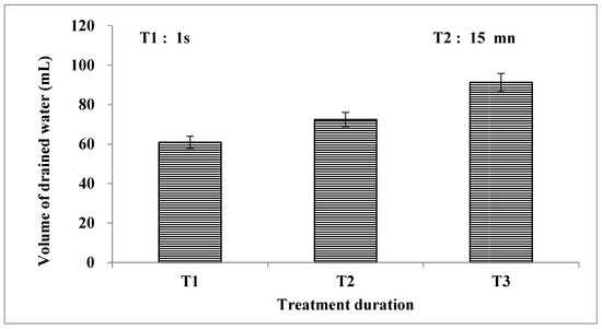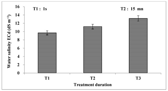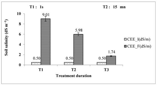 The impact of ET duration on soil salinity was highlighted (Figure 15). In comparison with the beginning of the trial, ECe values at end of the trial showed a highly significant increase, reaching 9.01 dS m−1 with T1, 5.98 dS m−1 with T2, and 1.74 dS m−1 with T3.