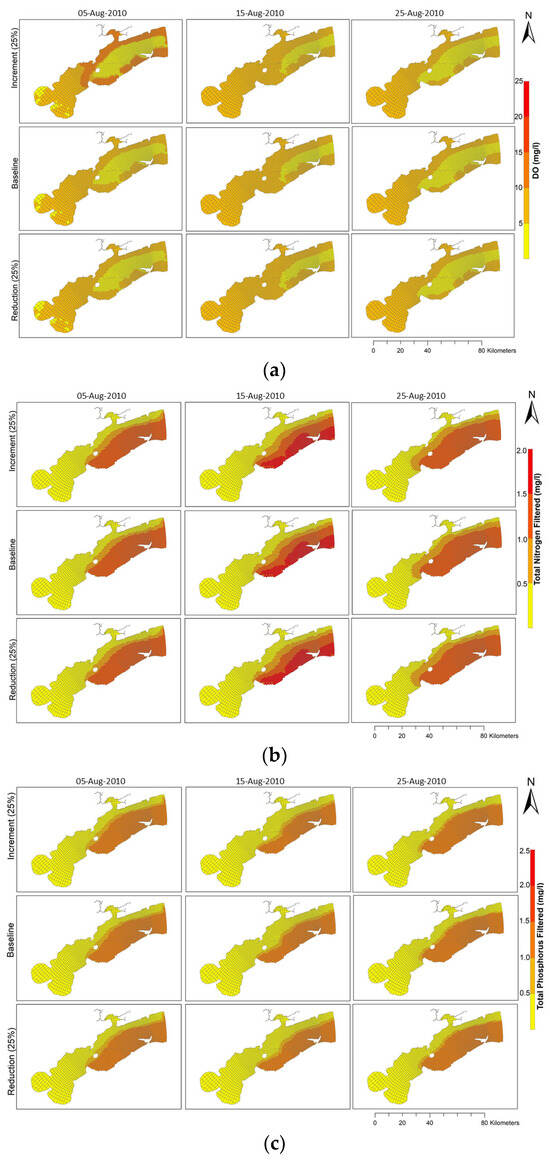 Figure 8b shows TN Filt sensitivity analysis due to the nutrient load variation during the tropical depression throughout the WMSS. Notable effects of the nutrient load variation were not observed near the inflow zone and throughout the WMSS grid. The major impact due to the tropical depression was detected as represented by a higher concentration of TN Filt in Figure 8b, and its impact was observed prevailing through 25 August.