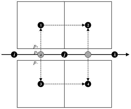 In the developed model, as shown in Figure 1, when the rock masses are initially continuous, there exists a pore seepage channel between every two blocks. Once the interface between blocks breaks, a fracture seepage channel is added along the interface, and a virtual node is added at the block interface, forming two pore–fracture seepage channels (o1, o3) from the fracture surfaces to the adjacent blocks. The pressure continuity across the fracture determines the fluid flow from the fracture to the surrounding porous rock matrix, which can be written as